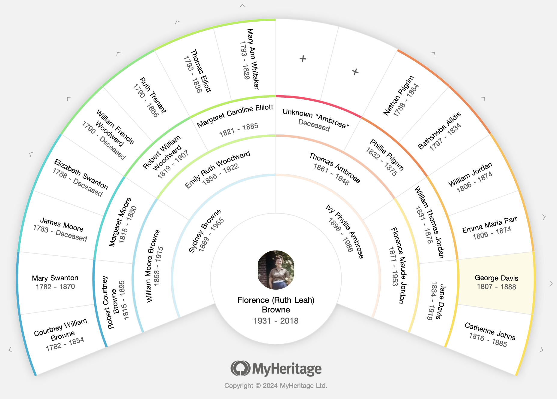 Below, are links to family trees of each of our ancestors who immigrated to Australia and pages on the history of each family as well as Ruth Leah Browne's ancestor tree. With eight family trees, one for each couple of Ruth Leah's great-great-grandparents, we could include all fourth cousins of David and Rafi Stern. But because Margaret Moore's brother Hastings Moore married Courtney William Browne's daughter Jane Browne, all descendants of James Moore and Elizabeth Swanton are included in the Browne Family Tree. So, we don't really need a separate Moore family tree - only James Moore and Elizabeth Swanton themselves are missing from the Browne Family Tree. Though we think that Phillis Pilgrim was Thomas Ambrose's mother, we haven't yet identified his father. So, we just include the Pilgrim family tree. Therefore, we only need six trees: Browne, Woodward, Elliott, Pilgrim, Jordan, and Davis. All trees start with the earliest known paternal line ancestor. But they don't include any other lines of ancestors nor those ancestors' descendants. Importantly, they don't include the ancestors of Clarinda Oliver, mother of George Davis, who has a deep documented ancestry in Cornwall. Ruth Leah's ancestor tree naturally includes all their ancestors. There are also five family webpages. We haven't written a webpage about the Elliott Family yet, and we only have a webpage for the Ambrose Family rather than the broader Pilgrim Family.