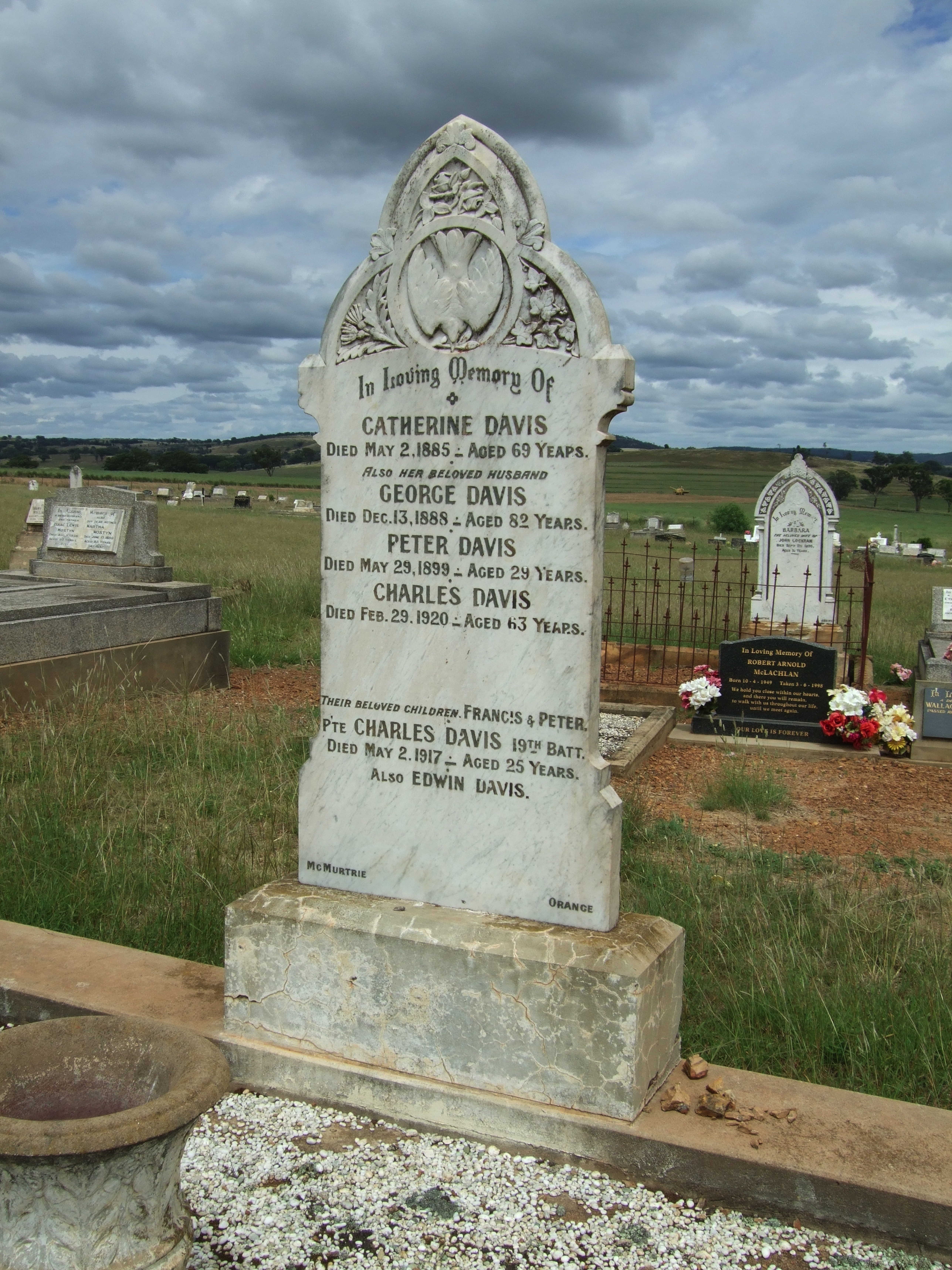They lived in Orange, NSW, and three more children were born there: Charles, Francis, and Peter. Their daughter, Emily, died in Orange in 1866. It appears that they also lived in Molong and/or Manildra, NSW. Catherine died on 2nd May 1885 and George on 13th December 1888. They are buried along with Peter and Charles in the Meranburn Cemetery near Manildra, NSW.