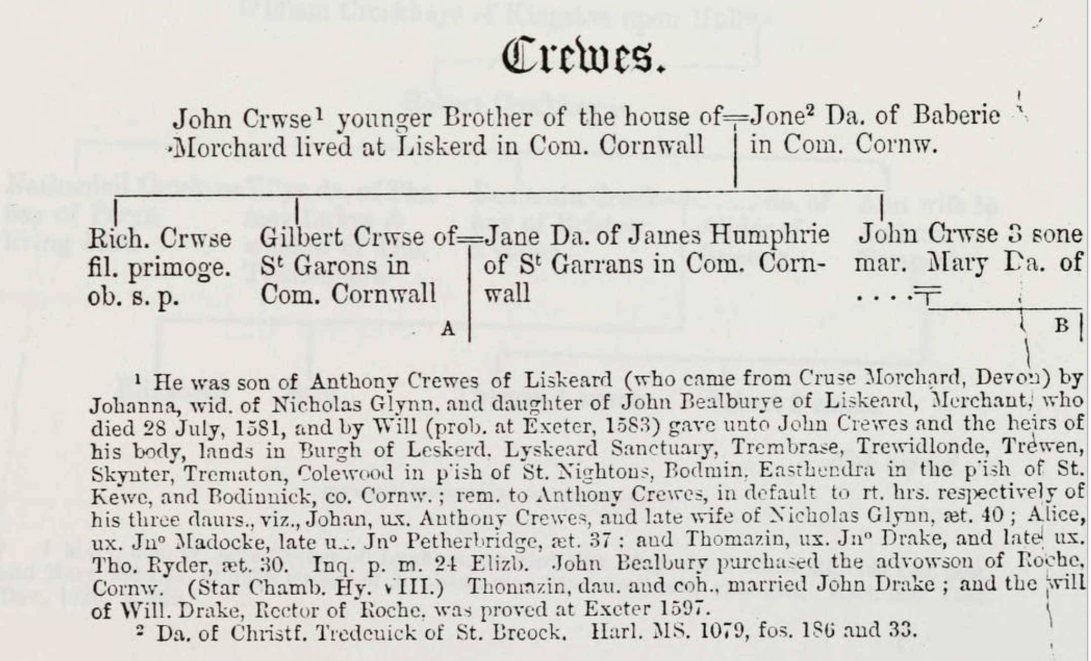 - Joane Crewes: On her baptism record she is called Johan but noted as a daughter. She is missing from the tree in the book The Visitations of Cornwall, which gives the Cornish Crewes family tree. Her father is given as John Crewes at her baptism in St Gerrans in 1593. The Visitation of Cornwall states that he was the son of John Crewes MP and the records show that John junior goes on to have the other three sons who are listed there.